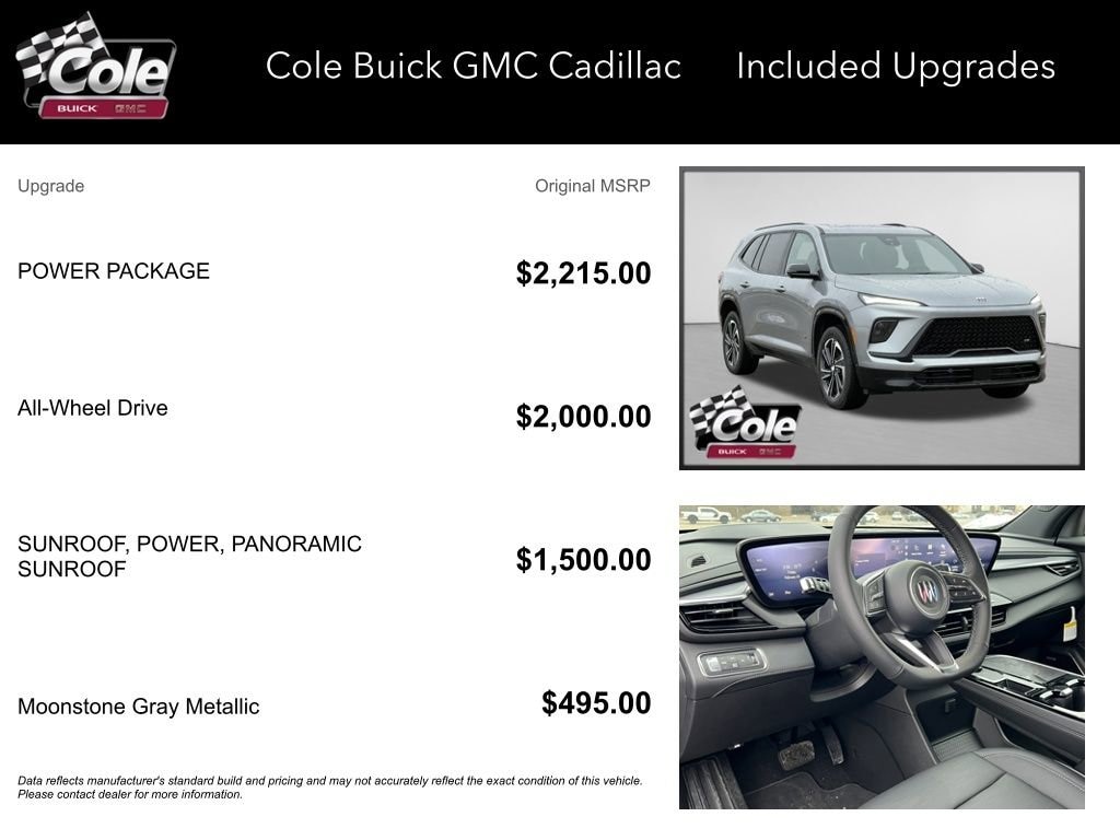 Price includes: $2500 - Bonus Cash. Exp. 03/02/2026 $500 - Purchase Allowance. Exp. 03/02/2026 WE DELIVER! BUY ONLINE-TEXT-EMAIL-CHAT-PHONE AND WE WILL DELIVER YOUR NEXT VEHICLE TO YOUR DOOR! FROM OUR SALES FLOOR TO YOUR DOOR! IT'S THAT EASY! moonstone gray metallic 2026 Buick Enclave Sport Touring AWD 8-Speed Automatic 2.5L DOHCAWD, 110-Volt Power Outlet, 12 Speakers, 2nd Row 1-Touch Flat Folding Seat, 3rd Row 60/40 Power Split-Folding Bench Seat, 3rd row seats: split-bench, 4-Wheel Disc Brakes, ABS brakes, Air Conditioning, Alloy wheels, AM/FM radio: SiriusXM with 360L, Apple CarPlay/Android Auto, Auto High-beam Headlights, Auto-dimming door mirrors, Auto-dimming Rear-View mirror, Automatic temperature control, Bose Premium 12-Speaker Audio System with Subwoofer, Brake assist, Bumpers: body-color, Compass, Delay-off headlights, Driver 4-Way Power Lumbar Seat Adjuster, Driver 8-Way Power Seat Adjuster, Driver door bin, Driver vanity mirror, Dual front impact airbags, Dual front side impact airbags, Electronic Stability Control, Emergency communication system: OnStar and Buick connected services capable, Four wheel independent suspension, Front anti-roll bar, Front Bucket Seats, Front Center Armrest, Front dual zone A/C, Front Passenger 4-Way Power Lumbar Seat Adjuster, Front Passenger 6-Way Power Seat Adjuster, Front reading lights, Fully automatic headlights, Head-Up Display, Heated door mirrors, Heated Driver and Front Passenger Seats, Heated front seats, Heated steering wheel, Heated Wiper Park, Illuminated entry, Inside Rearview Auo-Dimming Rear Camera Mirror, Leather steering wheel, Low tire pressure warning, Memory Settings, Navigation System, Occupant sensing airbag, Outside temperature display, Overhead airbag, Overhead console, Panic alarm, Passenger door bin, Passenger vanity mirror, Perforated Leatherette Seat Trim, Power door mirrors, Power driver seat, Power Liftgate, Power Package, Power Panoramic Sunroof with Sunshade, Power passenger seat, Power steering, Power windows, Preferred Equipment Group 1SM, Premium audio system: Buick Infotainment System, Radio data system, Radio: Infotainment Center, Rear air conditioning, Rear anti-roll bar, Rear reading lights, Rear side impact airbag, Rear window defroster, Rear window wiper, Remote keyless entry, Security system, SiriusXM with 360L Trial Subscription, Speed control, Speed-sensing steering, Spoiler, Sport steering wheel, Steering wheel mounted audio controls, Tachometer, Telescoping steering wheel, Tilt steering wheel, Traction control, Trip computer, Turn signal indicator mirrors, Universal Home Remote, Variably intermittent wipers, Voltmeter, Wheels: 20 Alloy with High Gloss Black and Machine Finish, Wireless Apple CarPlay, Wireless Google Android Auto, AWD.