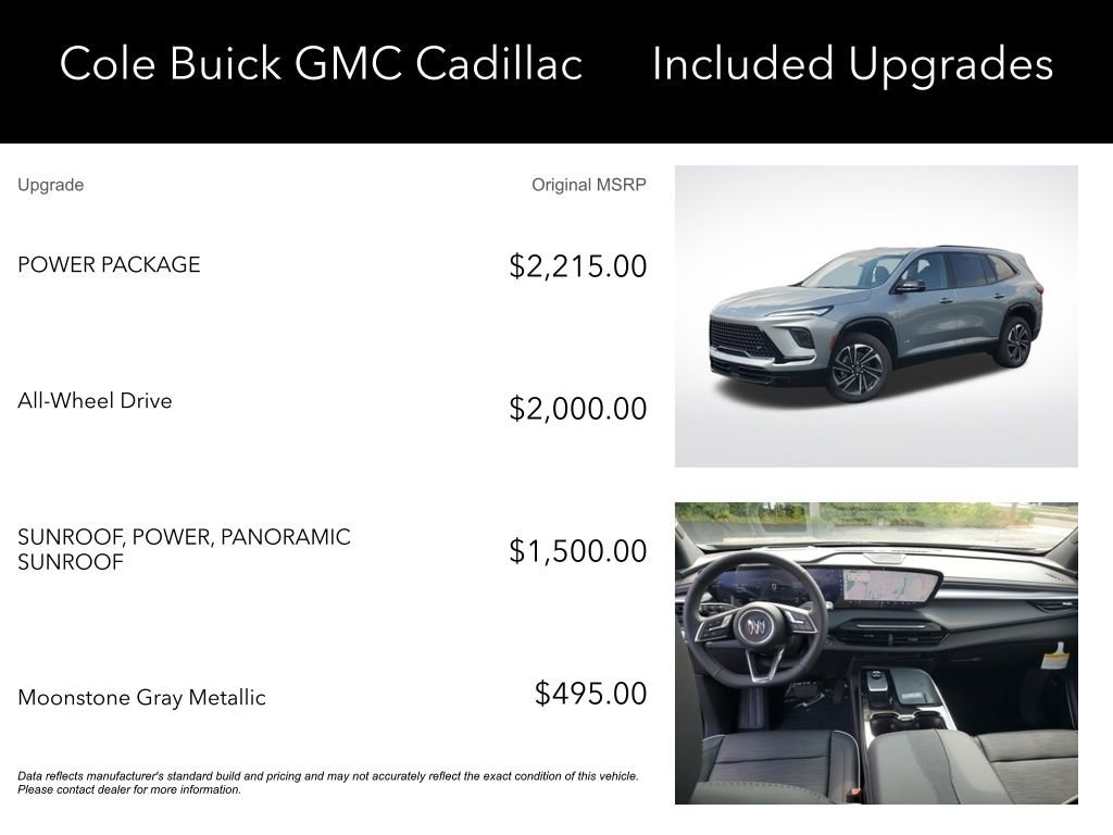 AWD, 110-Volt Power Outlet, 12 Speakers, 2nd Row 1-Touch Flat Folding Seat, 3rd Row 60/40 Power Split-Folding Bench, 3rd row seats: split-bench, 4-Wheel Disc Brakes, ABS brakes, Air Conditioning, Alloy wheels, AM/FM radio: SiriusXM with 360L, Apple CarPlay/Android Auto, Auto High-beam Headlights, Auto-dimming door mirrors, Auto-dimming Rear-View mirror, Automatic temperature control, Bose Premium 12-Speaker Audio System, Brake assist, Bumpers: body-color, Compass, Delay-off headlights, Driver 4-Way Power Lumbar Seat Adjuster, Driver 8-Way Power Seat Adjuster, Driver door bin, Driver vanity mirror, Dual front impact airbags, Dual front side impact airbags, Electronic Stability Control, Emergency communication system: OnStar and Buick connected services capable, Four wheel independent suspension, Front anti-roll bar, Front Bucket Seats, Front Center Armrest, Front dual zone A/C, Front Passenger 4-Way Power Lumbar Seat Adjuster, Front Passenger 6-Way Power Seat Adjuster, Front reading lights, Fully automatic headlights, Head-Up Display, Heated door mirrors, Heated Driver & Front Passenger Seats, Heated front seats, Heated steering wheel, Heated Wiper Park, Illuminated entry, Inside Rearview Auto-Dimming Rear Camera Mirror, Leather steering wheel, Low tire pressure warning, Memory Settings, Navigation System, Occupant sensing airbag, Outside temperature display, Overhead airbag, Overhead console, Panic alarm, Passenger door bin, Passenger vanity mirror, Perforated Leatherette Seat Trim, Power door mirrors, Power driver seat, Power Liftgate, Power Package, Power Panoramic Sunroof w/Sunshade, Power passenger seat, Power steering, Power windows, Preferred Equipment Group 1SM, Premium audio system: Buick Infotainment System, Radio data system, Radio: Infotainment Center, Rear air conditioning, Rear anti-roll bar, Rear reading lights, Rear side impact airbag, Rear window defroster, Rear window wiper, Remote keyless entry, Security system, SiriusXM w/360L Trial Subscription, Speed control, Speed-sensing steering, Spoiler, Sport steering wheel, Steering wheel mounted audio controls, Tachometer, Telescoping steering wheel, Tilt steering wheel, Traction control, Trip computer, Turn signal indicator mirrors, Universal Home Remote, Variably intermittent wipers, Voltmeter, Wheels: 20 Alloy w/High Gloss Black, Wireless Apple CarPlay, Wireless Google Android Auto, AWD.