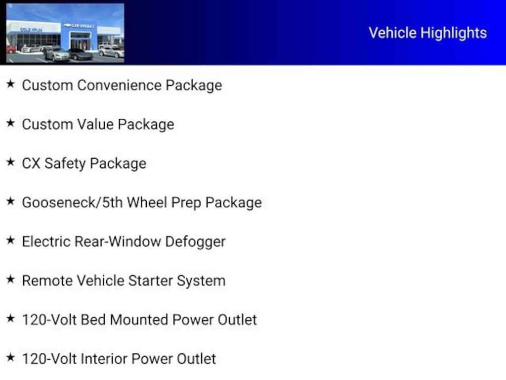 Silverado 2500HD Custom, 4D Crew Cab, 6.6L V8, 10-Speed Automatic, 4WD, Sterling Gray Metallic, Black Cloth, 120-Volt Bed Mounted Power Outlet, 120-Volt Interior Power Outlet, Auto-Dimming Inside Rear-View Mirror, Custom Convenience Package, Custom Value Package, CX Safety Package, Electric Rear-Window Defogger, Gooseneck/5th Wheel Prep Package, LED Cargo Area Lighting, Rear Cross Traffic Alert, Remote Vehicle Starter System, Unauthorized Entry Theft-Deterrent System, 170 Amp Alternator, 2-Speed Electronic Shift Transfer Case, 220 Amp Alternator, 3.5 Diagonal Monochromatic Display DIC, 3.73 Rear Axle Ratio, 4-Wheel Disc Brakes, 6 Speakers, 6-Speaker Audio System, 720 Cold-Cranking Amps Heavy-Duty Battery, ABS brakes, Air Conditioning, Alloy wheels, AM/FM radio: SiriusXM with 360L, Apple CarPlay/Android Auto, Auto High-beam Headlights, Bed View Camera, Black Mirror Caps, Bluetooth® For Phone, Brake assist, Chevrolet Connected Access Capable, Cloth Seat Trim, Color-Keyed Carpeting Floor Covering, Compass, Deep-Tinted Glass, Delay-off headlights, Driver door bin, Dual front impact airbags, Dual front side impact airbags, Durabed Pickup Bed, Electronic Stability Control, Emergency communication system: OnStar, Front anti-roll bar, Front Center Armrest w/Storage, Front reading lights, Front Rubberized Vinyl Floor Mats, Front wheel independent suspension, Fully automatic headlights, HD Rear Vision Camera, Heated door mirrors, Heated Vertical Trailering Mirrors, Illuminated entry, Inside Rear-View Auto-Dimming Mirror, LED Smoked Amber Roof Marker Lamps, Locking Tailgate, Low tire pressure warning, Manual Tilt-Wheel Steering Column, Occupant sensing airbag, OnStar Services Capable, Outside temperature display, Overhead airbag, Overhead console, Panic alarm, Passenger door bin, Passenger vanity mirror, Power Door Locks, Power door mirrors, Power steering, Power windows, Preferred Equipment Group 1CX, Premium audio system: Chevrolet Infotainment 3, Push Button Start, Radio: Chevrolet Infotainment 3 System, Rear reading lights, Rear Rubberized Vinyl Floor Mats, Rear step bumper, Remote Keyless Entry, Remote keyless entry, Snow Plow Prep/Camper Package, Speed control, Split folding rear seat, Standard Tailgate, Suspension Package, Tachometer, Tilt steering wheel, Traction control, Trip computer, Turn signal indicator mirrors, Variably intermittent wipers, Voltmeter, Wheels: 20 10-Spoke Machined Aluminum, Wi-Fi Hotspot Capable, Wireless Phone Projection, Silverado 2500HD Custom, 4D Crew Cab, 6.6L V8, 10-Speed Automatic, 4WD, Sterling Gray Metallic, Black Cloth, 120-Volt Bed Mounted Power Outlet, 120-Volt Interior Power Outlet, Auto-Dimming Inside Rear-View Mirror, Custom Convenience Package, Custom Value Package, CX Safety Package, Electric Rear-Window Defogger, Gooseneck/5th Wheel Prep Package, LED Cargo Area Lighting, Rear Cross Traffic Alert, Remote Vehicle Starter System, Unauthorized Entry Theft-Deterrent System.
