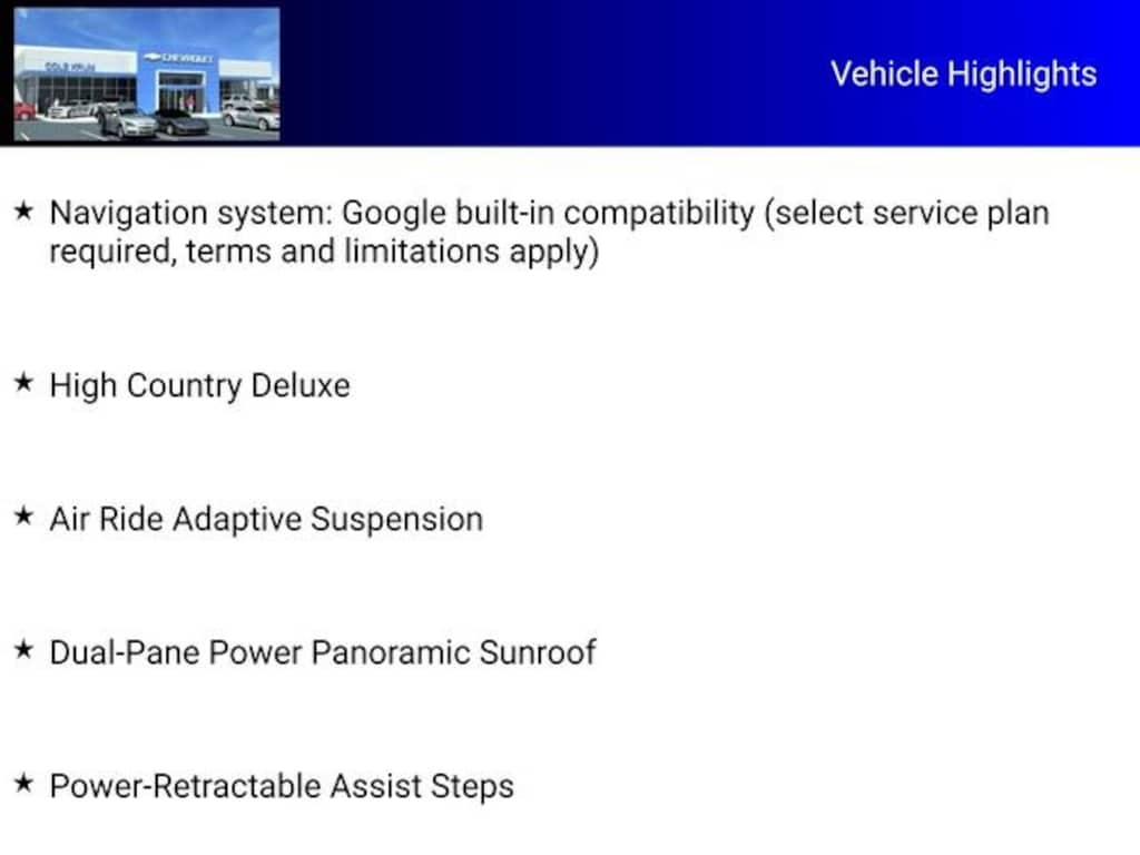 Tahoe High Country, 4D Sport Utility, EcoTec3 6.2L V8, 10-Speed Automatic with Overdrive, 4WD, Polar White Tricoat, Jet Black Leather, Air Ride Adaptive Suspension, Dual-Pane Power Panoramic Sunroof, High Country Deluxe, Navigation system: Google built-in compatibility (select service plan required, terms and limitations apply), Power-Retractable Assist Steps, 10 Speakers, 15 Diagonal Multi-Color Head-Up Display, 1st & 2nd Row Color-Keyed Carpeted Floor Mats, 3-Spoke Wrapped Steering Wheel, 3.23 Rear Axle Ratio, 3rd Row 60/40 Power-Folding Split-Bench Seat, 3rd row seats: split-bench, 4-Way Power Driver Lumbar Seat Adjuster, 4-Way Power Front Passenger Lumbar Seat Adjuster, 4-Wheel Disc Brakes, 8-Way Power Driver Seat Adjuster, 8-Way Power Front Passenger Seat Adjuster, ABS brakes, Adaptive suspension, Air Conditioning, Alloy wheels, AM/FM radio: SiriusXM with 360L, Apple CarPlay/Android Auto, Auto High-beam Headlights, Auto-dimming door mirrors, Auto-dimming Rear-View mirror, Auto-leveling suspension, Automatic temperature control, Black Roof Rack Cross Rails, Bose 10-Speaker Centerpoint Surround Audio Sys Ft, Brake assist, Bright Front & Rear Door Sill Plates, Bumpers: body-color, Chrome Door Handles w/Body-Color Strip, Color-Keyed Carpeting Floor Covering, Compass, Delay-off headlights, Driver & Front Passenger Heated & Ventilated Seats, Driver door bin, Driver vanity mirror, Dual Exhaust System, Dual front impact airbags, Dual front side impact airbags, Electronic Stability Control, Emergency communication system: OnStar and Chevrolet connected services capable, Exterior Parking Camera Rear, Floor Console, Four wheel independent suspension, Front anti-roll bar, Front Bucket Seats, Front Center Armrest, Front dual zone A/C, Front fog lights, Front LED Fog Lamps, Front reading lights, Frontal Driver & Outboard Passenger Airbags, Fully automatic headlights, Garage door transmitter, Heads-Up Display, Heated 2nd Row Outboard Seats, Heated door mirrors, Heated Driver & Front Passenger Seats, Heated front seats, Heated rear seats, Heated Steering Wheel, Heated steering wheel, Illuminated entry, Inside Rearview Auto-Dimming Rear Camera Mirror, Interior Camera, Key Card, LED Headlamps w/LED Daytime Running Lamps, LED Tail Lamps, Low tire pressure warning, Magnetic Ride Control Suspension, Memory seat, Memory Settings, Occupant sensing airbag, Outside Heated Power-Adjustable Mirrors, Outside temperature display, Overhead airbag, Overhead console, Panic alarm, Passenger door bin, Passenger vanity mirror, Perforated Leather Seat Trim, Power door mirrors, Power driver seat, Power Liftgate, Power passenger seat, Power Release 2nd Row Bucket Seats, Power steering, Power Tilt & Telescopic Steering Column, Power windows, Premium audio system: Chevrolet Infotainment 3 Premium, Radio data system, Radio: 17.7 Diagonal Advanced Color LCD Display, Rain sensing wipers, Rear air conditioning, Rear anti-roll bar, Rear Power Liftgate, Rear reading lights, Rear window defroster, Rear window wiper, Remote keyless entry, Remote Start, Security system, Set of 4 Wheel Locks (LPO), SiriusXM w/360L Trial Subscription, Speed control, Speed-sensing steering, Split folding rear seat, Spoiler, Steering wheel memory, Steering wheel mounted audio controls, Tachometer, Telescoping steering wheel, Tilt steering wheel, Traction control, Trip computer, Turn signal indicator mirrors, Universal Home Remote, Variably intermittent wipers, Ventilated front seats, Voltmeter, Wheels: 22 x 9 Bright Machined Aluminum, Wheels: 24 x 9.5 Bright Machined, Wireless Phone Charging, Tahoe High Country, 4D Sport Utilit