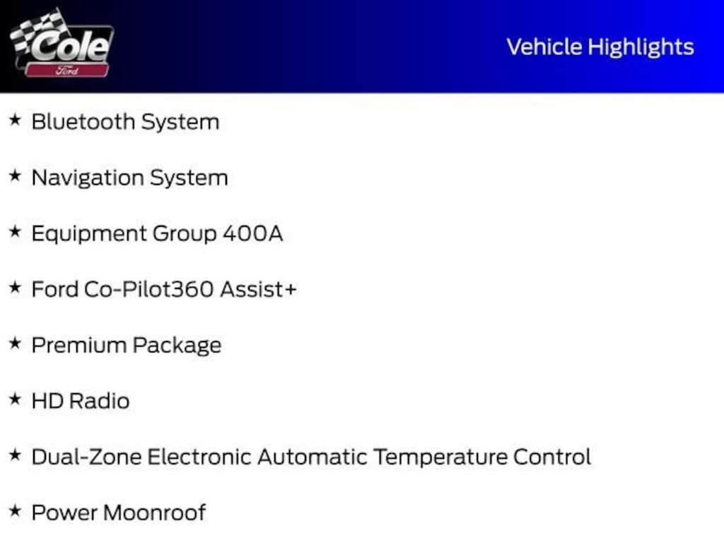 Bluetooth System, Navigation System, Auto-Dimming Rear-View Mirror, Body-Colored Door Handles, Dual-Zone Electronic Automatic Temperature Control, Equipment Group 400A, Evasive Steering Assist, Ford Co-Pilot360 Assist+, HD Radio, Heated Steering Wheel, Intelligent Adaptive Cruise Control w/Stop & Go, Leather-Trimmed 2-Tone Heated Front Bucket Seats, Memory Driver's Seat & Sideview Mirror, Power Moonroof, Premium Package, Rear Parking Sensors, Remote Start System, Universal Garage Door Opener (UGDO), Voice-Activated Touchscreen Navigation System, Wireless Charging Pad, 3.80 Axle Ratio, 4-Wheel Disc Brakes, 6 Speakers, ABS brakes, Air Conditioning, Alloy wheels, AM/FM radio: SiriusXM, AM/FM Stereo, Auto High-beam Headlights, Automatic temperature control, Brake assist, Compass, Delay-off headlights, Driver door bin, Driver vanity mirror, Dual front impact airbags, Dual front side impact airbags, Electronic Stability Control, Emergency communication system: SYNC 3 911 Assist, Four wheel independent suspension, Front & Rear Floor Liners w/Carpet Mats, Front anti-roll bar, Front Bucket Seats, Front Center Armrest, Front fog lights, Front License Plate Bracket, Front reading lights, Fully automatic headlights, Heated door mirrors, Illuminated entry, Knee airbag, Low tire pressure warning, Occupant sensing airbag, Outside temperature display, Overhead airbag, Overhead console, Panic alarm, Passenger door bin, Passenger vanity mirror, Power door mirrors, Power driver seat, Power steering, Power windows, Radio data system, Rear anti-roll bar, Rear reading lights, Rear seat center armrest, Rear window defroster, Rear window wiper, Remote keyless entry, Security system, SiriusXM, Speed control, Speed-sensing steering, Speed-Sensitive Wipers, Split folding rear seat, Steering wheel mounted audio controls, SYNC 3 Communications & Entertainment System, Tachometer, Telescoping steering wheel, Tilt steering wheel, Traction control, Trip computer, Unique Style Cloth Sport Contour Bucket Seats, Variably intermittent wipers, Wheels: 17" Carbonized Gray-Painted Aluminum, Auto-Dimming Rear-View Mirror, Body-Colored Door Handles, Dual-Zone Electronic Automatic Temperature Control, Equipment Group 400A, Evasive Steering Assist, Ford Co-Pilot360 Assist+, HD Radio, Heated Steering Wheel, Intelligent Adaptive Cruise Control w/Stop & Go, Leather-Trimmed 2-Tone Heated Front Bucket Seats, Memory Driver's Seat & Sideview Mirror, Power Moonroof, Premium Package, Rear Parking Sensors, Remote Start System, Universal Garage Door Opener (UGDO), Voice-Activated Touchscreen Navigation System, Wireless Charging Pad.