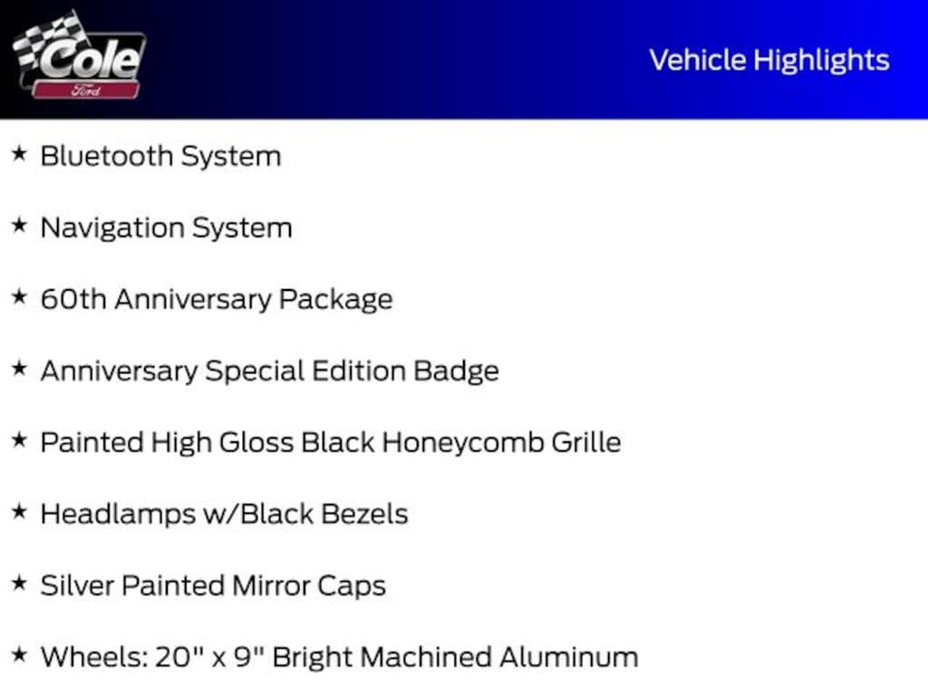 Bluetooth System, Navigation System, 20" Wheels, 60th Anniversary Package, Anniversary Special Edition Badge, Headlamps w/Black Bezels, Painted High Gloss Black Honeycomb Grille, Silver Painted Mirror Caps, Wheels: 20" x 9" Bright Machined Aluminum, 3.55 Limited Slip Rear Axle, 4-Wheel Disc Brakes, ABS brakes, Active Valve Performance Exhaust, Air Conditioning, Alloy wheels, AM/FM Stereo, Auto High-beam Headlights, Automatic temperature control, B&O Sound System by Bang & Olufsen w/12 Speakers, Brake assist, Brembo Brake System, Brembo Brake System w/Performance Linings, Bumpers: body-color, Compass, Delay-off headlights, Driver door bin, Driver vanity mirror, Dual front impact airbags, Dual front side impact airbags, Electronic Stability Control, Emergency communication system: 911 Assist, Equipment Group 401A High Package, Exterior Parking Camera Rear, Four wheel independent suspension, Front anti-roll bar, Front Bucket Seats, Front Center Armrest, Front dual zone A/C, Front reading lights, Fully automatic headlights, Illuminated Door-Sill Scuff Plates, Illuminated entry, Knee airbag, Leather Shift Knob, Leather steering wheel, Low tire pressure warning, Occupant sensing airbag, Outside temperature display, Overhead airbag, Overhead console, Panic alarm, Passenger door bin, Passenger vanity mirror, Power door mirrors, Power steering, Power windows, Radio data system, Rain sensing wipers, Rear anti-roll bar, Rear Parking Sensors, Rear window defroster, Remote keyless entry, Speed control, Speed-sensing steering, Speed-Sensitive Wipers, Split folding rear seat, Spoiler, Sport steering wheel, Steering wheel mounted audio controls, SYNC 4, Tachometer, Telescoping steering wheel, Tilt steering wheel, Traction control, Trip computer, Variably intermittent wipers, Voltmeter, 20" Wheels, 60th Anniversary Package, Anniversary Special Edition Badge, Headlamps w/Black Bezels, Painted High Gloss Black Honeycomb Grille, Silver Painted Mirror Caps, Wheels: 20" x 9" Bright Machined Aluminum.