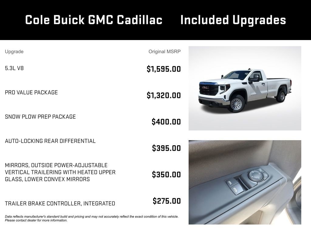 10-Speed Automatic, 4WD, Black Cloth, 2 Charge/Data USB Ports, 2 Speakers, 2-Speaker Audio System Feature, 220 Amp Alternator, 4-Way Manual Driver Seat Adjuster, 4-Way Manual Passenger Seat Adjuster, 4-Wheel Disc Brakes, ABS brakes, Air Conditioning, AM/FM radio, Apple CarPlay/Android Auto, Auto High-beam Headlights, Auto-Locking Rear Differential, Automatic Emergency Braking, Auxiliary External Transmission Oil Cooler, Brake assist, Buckle to Drive, Bumpers: chrome, Chrome Header w/Flat Black Grille Insert Bars, Compass, Convenience Package, Cruise Control, Deep-Tinted Glass, Delay-off headlights, Driver door bin, Dual front impact airbags, Dual front side impact airbags, Electric Rear-Window Defogger, Electronic Stability Control, External Engine Oil Cooling, EZ Lift Power Lock & Release Tailgate, Following Distance Indicator, Forward Collision Alert, Front 40/20/40 Split-Bench Seat, Front anti-roll bar, Front Center Armrest w/Storage, Front Frame-Mounted Black Recovery Hooks, Front Pedestrian Braking, Front reading lights, Front wheel independent suspension, Fully automatic headlights, GMC Connected Access Capable, HD Rear Vision Camera, Heated door mirrors, Heavy-Duty Air Filter, Hitch Guidance, Illuminated entry, Inside Rear-View Auto-Dimming Mirror, Integrated Trailer Brake Controller, IntelliBeam Automatic High Beam On/Off, Lane Keep Assist w/Lane Departure Warning, LED Cargo Area Lighting, Low tire pressure warning, Occupant sensing airbag, OnStar & GMC Connected Services Capable, Outside temperature display, Overhead airbag, Overhead console, Panic alarm, Passenger door bin, Passenger vanity mirror, Power Door Locks, Power door mirrors, Power Front Windows w/Driver Express Up/Down, Power Front Windows w/Passenger Express Down, Power steering, Power windows, Preferred Equipment Group 1SA, Premium audio system: GMC Infotainment System, Pro Value Package, Push Button Start, Pwr-Adjustable Vertical Trailering Outside Mirrors, Radio data system, Radio: GMC Infotainment Audio System, Rear reading lights, Rear step bumper, Remote Keyless Entry, Remote keyless entry, Snow Plow Prep Package, Solar Absorbing Tinted Glass, Speed-sensing steering, Standard Suspension Package, Tachometer, Tilt steering wheel, Traction control, Trailering Package, Trip computer, Variably intermittent wipers, Vinyl Seat Trim, Voltmeter, Wheels: 17 x 8 Silver Painted Steel, Wi-Fi Hotspot Capable, Wireless Apple CarPlay/Wireless Android Auto, 10-Speed Automatic, 4WD, Black Cloth.