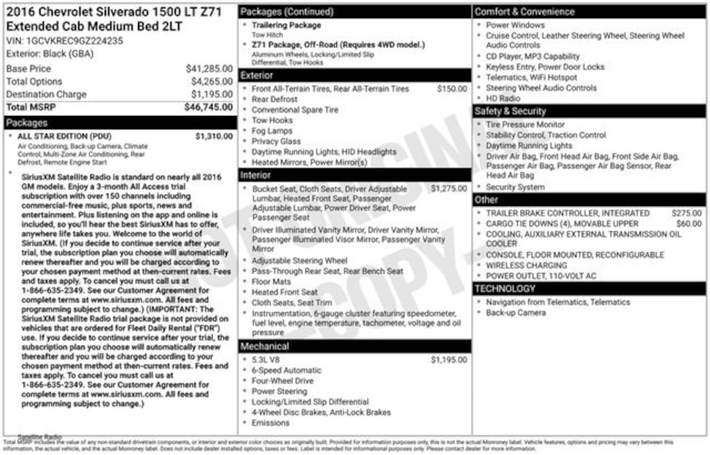 6-Speed Automatic Electronic with Overdrive, 4WD, Black Cloth, 110-Volt AC Power Outlet, All Star Edition, Dual-Zone Automatic Climate Control, Electric Rear-Window Defogger, Rear Vision Camera w/Dynamic Guide Lines, Remote Vehicle Starter System, Trailering Package, 10-Way Power Driver's Seat Adjuster, 150 Amp Alternator, 3.42 Rear Axle Ratio, 4 Movable Upper Cargo Tie Downs, 4-Wheel Disc Brakes, 4.2" Diagonal Color Display Driver Info Center, 40/20/40 Front Split Bench Seat, 6 Speaker Audio System, 6 Speakers, ABS brakes, Air Conditioning, Alloy wheels, AM/FM radio: SiriusXM, Auxiliary External Transmission Oil Cooler, Bluetooth® For Phone, Body Color Bodyside Moldings, Body Color Door Handles, Body-Color Mirror Caps, Body-Color Power Adjustable Heated Outside Mirrors, Bodyside moldings, Brake assist, CD player, Cloth Seat Trim, Color-Keyed Carpeting w/Rubberized Vinyl Floor Mats, Compass, Deep-Tinted Glass, Delay-off headlights, Driver & Front Passenger Illuminated Vanity Mirrors, Driver door bin, Driver vanity mirror, Dual front impact airbags, Dual front side impact airbags, Electronic Stability Control, Emergency communication system: OnStar Guidance, EZ Lift & Lower Tailgate, Floor Mounted Console, Front anti-roll bar, Front Center Armrest w/Storage, Front Chrome Bumper, Front Power Reclining Bucket Seats, Front reading lights, Front wheel independent suspension, Fully automatic headlights, HD Radio, Heated door mirrors, Heated Driver & Front Passenger Seats, Heavy-Duty Rear Locking Differential, High-Intensity Discharge Headlights, Illuminated entry, Integrated Trailer Brake Controller, Leather Wrapped Steering Wheel w/Cruise Controls, Low tire pressure warning, Manual Tilt Wheel Steering Column, Manual Tilt/Telescoping Steering Column, Occupant sensing airbag, OnStar 6 Months Guidance Plan, OnStar w/4G LTE, Outside temperature display, Overhead airbag, Overhead console, Panic alarm, Passenger door bin, Passenger vanity mirror, Power door mirrors, Power steering, Power windows, Power Windows w/Driver Express Up, Premium audio system: Chevrolet MyLink, Radio data system, Radio: AM/FM 8" Diagonal Color Touch Screen, Rear 60/40 Folding Bench Seat (Folds Up), Rear Chrome Bumper, Rear reading lights, Rear step bumper, Rear Wheelhouse Liners, Remote Keyless Entry, Remote keyless entry, Remote Locking Tailgate, Single Slot CD/MP3 Player, SiriusXM Satellite Radio, Speed control, Speed-sensing steering, Split folding rear seat, Steering Wheel Audio Controls, Steering wheel mounted audio controls, Tachometer, Theft Deterrent System (Unauthorized Entry), Thin Profile LED Fog Lamps, Tilt steering wheel, Traction control, Trip computer, Variably intermittent wipers, Voltmeter, Wireless Charging, 6-Speed Automatic Electronic with Overdrive, 4WD, Black Cloth, 110-Volt AC Power Outlet, All Star Edition, Dual-Zone Automatic Climate Control, Electric Rear-Window Defogger, Rear Vision Camera w/Dynamic Guide Lines, Remote Vehicle Starter System, Trailering Package.