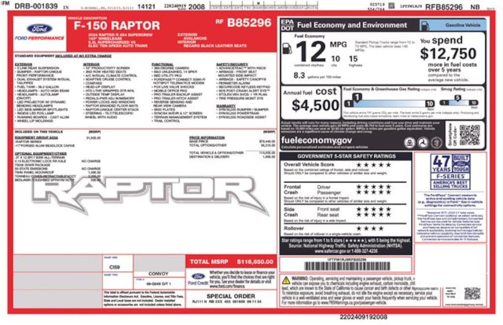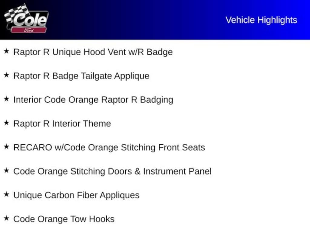 4WD, Code Orange Stitching Doors & Instrument Panel, Code Orange Tow Hooks, Dual Valve Shocks, Equipment Group 803A Raptor R, Interior Code Orange Raptor R Badging, Modular Front Bumper, Navigation system: Connected Navigation, Raptor R Badge Tailgate Applique, Raptor R Exterior Graphics, Raptor R Exterior Theme, Raptor R Interior Theme, Raptor R Unique Grille, Raptor R Unique Hood Vent w/R Badge, RECARO w/Code Orange Stitching Front Seats, Removes 2KW Pro Power Onboard, Unique Carbon Fiber Appliques, Wheels: Raptor R Unique 17" Forged Aluminum, 14 Speakers, 17" Cast Aluminum Wheels, 4-Wheel Disc Brakes, ABS brakes, Adaptive suspension, Adjustable pedals, Air Conditioning, Alloy wheels, AM/FM radio: SiriusXM with 360L, Auto High-beam Headlights, Auto tilt-away steering wheel, Auto-dimming door mirrors, Auto-dimming Rear-View mirror, Automatic temperature control, Brake assist, Bumpers: body-color, Compass, Delay-off headlights, Driver door bin, Driver vanity mirror, Dual front impact airbags, Dual front side impact airbags, Electronic Locking w/4.10 Axle Ratio, Electronic Stability Control, Emergency communication system: SYNC 4 911 Assist, Front anti-roll bar, Front Bucket Seats, Front Center Armrest, Front dual zone A/C, Front fog lights, Front reading lights, Front wheel independent suspension, Fully automatic headlights, Garage door transmitter, Heads-Up Display, Heated door mirrors, Heated front seats, Heated rear seats, Heated steering wheel, Illuminated entry, Lane Departure Warning System, Leather Trim Seats, Low tire pressure warning, Memory seat, Occupant sensing airbag, Outside temperature display, Overhead airbag, Overhead console, Panic alarm, Passenger door bin, Passenger vanity mirror, Pedal memory, Power door mirrors, Power driver seat, Power passenger seat, Power steering, Power windows, Radio data system, Radio: B&O Unleashed Sound System by Bang & Olufsen, Rain sensing wipers, Rear reading lights, Rear step bumper, Rear window defroster, Remote keyless entry, Security system, Speed control, Speed-sensing steering, Split folding rear seat, Steering wheel memory, Steering wheel mounted audio controls, SYNC 4 w/Enhanced Voice Recognition, Tachometer, Telescoping steering wheel, Tilt steering wheel, Traction control, Trip computer, Turn signal indicator mirrors, Variably intermittent wipers, Ventilated front seats, 4WD, Code Orange Stitching Doors & Instrument Panel, Code Orange Tow Hooks, Dual Valve Shocks, Equipment Group 803A Raptor R, Interior Code Orange Raptor R Badging, Modular Front Bumper, Navigation system: Connected Navigation, Raptor R Badge Tailgate Applique, Raptor R Exterior Graphics, Raptor R Exterior Theme, Raptor R Interior Theme, Raptor R Unique Grille, Raptor R Unique Hood Vent w/R Badge, RECARO w/Code Orange Stitching Front Seats, Removes 2KW Pro Power Onboard, Unique Carbon Fiber Appliques, Wheels: Raptor R Unique 17" Forged Aluminum.