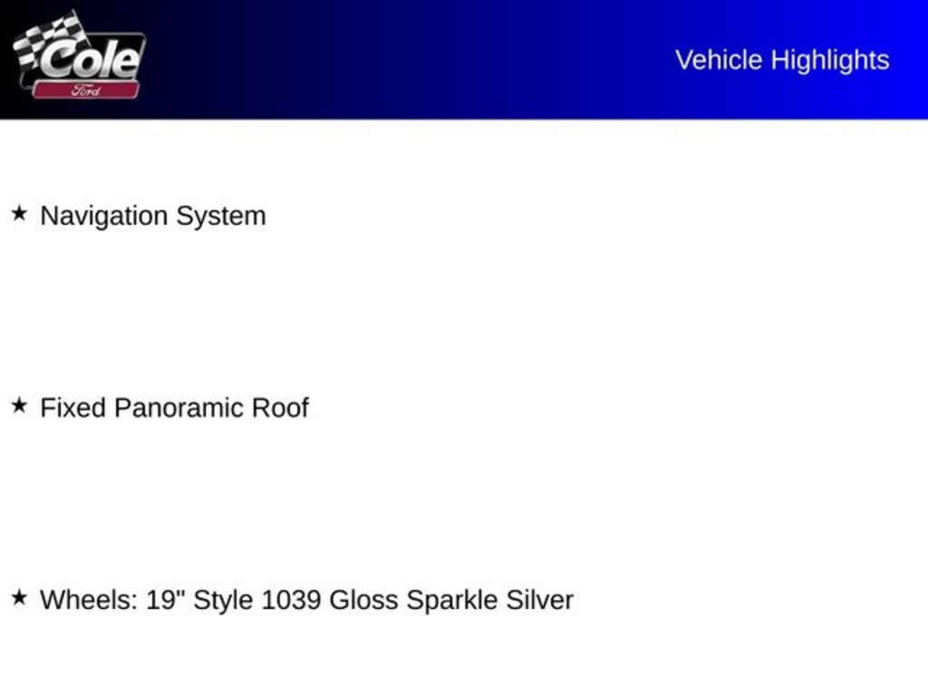 Fixed Panoramic Roof, Navigation System, Wheels: 19" Style 1039 Gloss Sparkle Silver, 12-Way Electric Memory Front Seats, 4-Wheel Disc Brakes, 4.54 Axle Ratio, 6 Speakers, ABS brakes, Air Conditioning, Alloy wheels, AM/FM radio, Apple CarPlay & Android Auto, Auto High-beam Headlights, Auto-dimming door mirrors, Auto-dimming Rear-View mirror, Automatic temperature control, Brake assist, Bumpers: body-color, Connected Navigation Pro, Delay-off headlights, Driver door bin, Driver vanity mirror, Dual front impact airbags, Dual front side impact airbags, Electronic Stability Control, Emergency communication system: InControl Protect, Exterior Parking Camera Rear, Four wheel independent suspension, Front anti-roll bar, Front Bucket Seats, Front Center Armrest, Front dual zone A/C, Front reading lights, Fully automatic headlights, Garage door transmitter: HomeLink, Grained Leather Seat Trim, Heated door mirrors, Illuminated entry, Knee airbag, Leather Shift Knob, Low tire pressure warning, Memory seat, Occupant sensing airbag, Outside temperature display, Overhead airbag, Overhead console, Panic alarm, Passenger door bin, Passenger vanity mirror, Power door mirrors, Power driver seat, Power Liftgate, Power passenger seat, Power steering, Power windows, Radio data system, Radio: 6-Speaker Audio System, Rain sensing wipers, Rear anti-roll bar, Rear fog lights, Rear reading lights, Rear seat center armrest, Rear window defroster, Rear window wiper, Remote keyless entry, Security system, Smartphone Pack, Speed control, Speed-sensing steering, Speed-Sensitive Wipers, Split folding rear seat, Spoiler, Steering wheel mounted audio controls, Tachometer, Telescoping steering wheel, Tilt steering wheel, Traction control, Trip computer, Variably intermittent wipers, Fixed Panoramic Roof, Navigation System, Wheels: 19" Style 1039 Gloss Sparkle Silver.