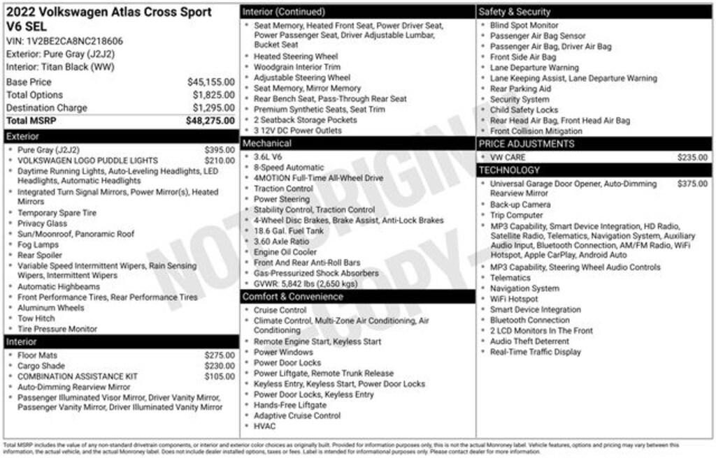 Navigation System, 3.60 Axle Ratio, 4-Wheel Disc Brakes, 6 Speakers, ABS brakes, Air Conditioning, Alloy wheels, AM/FM radio: SiriusXM with 360L, Auto High-beam Headlights, Auto-dimming Rear-View mirror, Automatic temperature control, Brake assist, Bumpers: body-color, Compass, Delay-off headlights, Driver door bin, Driver vanity mirror, Dual front impact airbags, Dual front side impact airbags, Electronic Stability Control, Emergency communication system, Exterior Parking Camera Rear, First Aid Kit, Four wheel independent suspension, Frameless Auto-Dimming Rearview Mirror, Front anti-roll bar, Front Bucket Seats, Front Center Armrest, Front dual zone A/C, Front fog lights, Front reading lights, Fully automatic headlights, Heated Comfort Front Bucket Seats, Heated door mirrors, Heated front seats, Heated steering wheel, Heavy Duty Trunk Liner w/VW CarGo Blocks, Illuminated entry, Leather Shift Knob, Low tire pressure warning, Memory seat, Occupant sensing airbag, Outside temperature display, Overhead airbag, Overhead console, Panic alarm, Passenger door bin, Passenger vanity mirror, Perforated V-Tex Leatherette Seating Surfaces, Power door mirrors, Power driver seat, Power Liftgate, Power moonroof: Panoramic, Power passenger seat, Power steering, Power windows, Privacy Cover (DISC), Radio data system, Radio: MIB3 Discover Media w/8" Touchscreen Navigation, Rain sensing wipers, Rear anti-roll bar, Rear reading lights, Rear seat center armrest, Rear window defroster, Rear window wiper, Remote keyless entry, Roadside Assistance Kit, Roof rack: rails only, Rubber Mats Kit, Security system, Speed control, Speed-sensing steering, Split folding rear seat, Spoiler, Standard Suspension, Steering wheel mounted audio controls, Tachometer, Telescoping steering wheel, Tilt steering wheel, Traction control, Trip computer, Turn signal indicator mirrors, Variably intermittent wipers, Volkswagen Logo Puddle Lights, VW Care, Wheels: 20" x 8J 5-Spoke 2-Tone Machined Alloy, Navigation System.